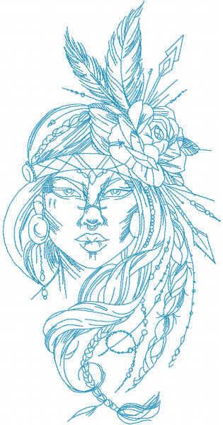 Celebrate cultural artistry with this stunning stitching pattern depicting a graceful Indian girl adorned with flowing feathers and a delicate rose. This continental pride collection piece brings together traditional elegance and contemporary craftsmanship, making it an ideal choice for adding meaningful details to your personal projects.