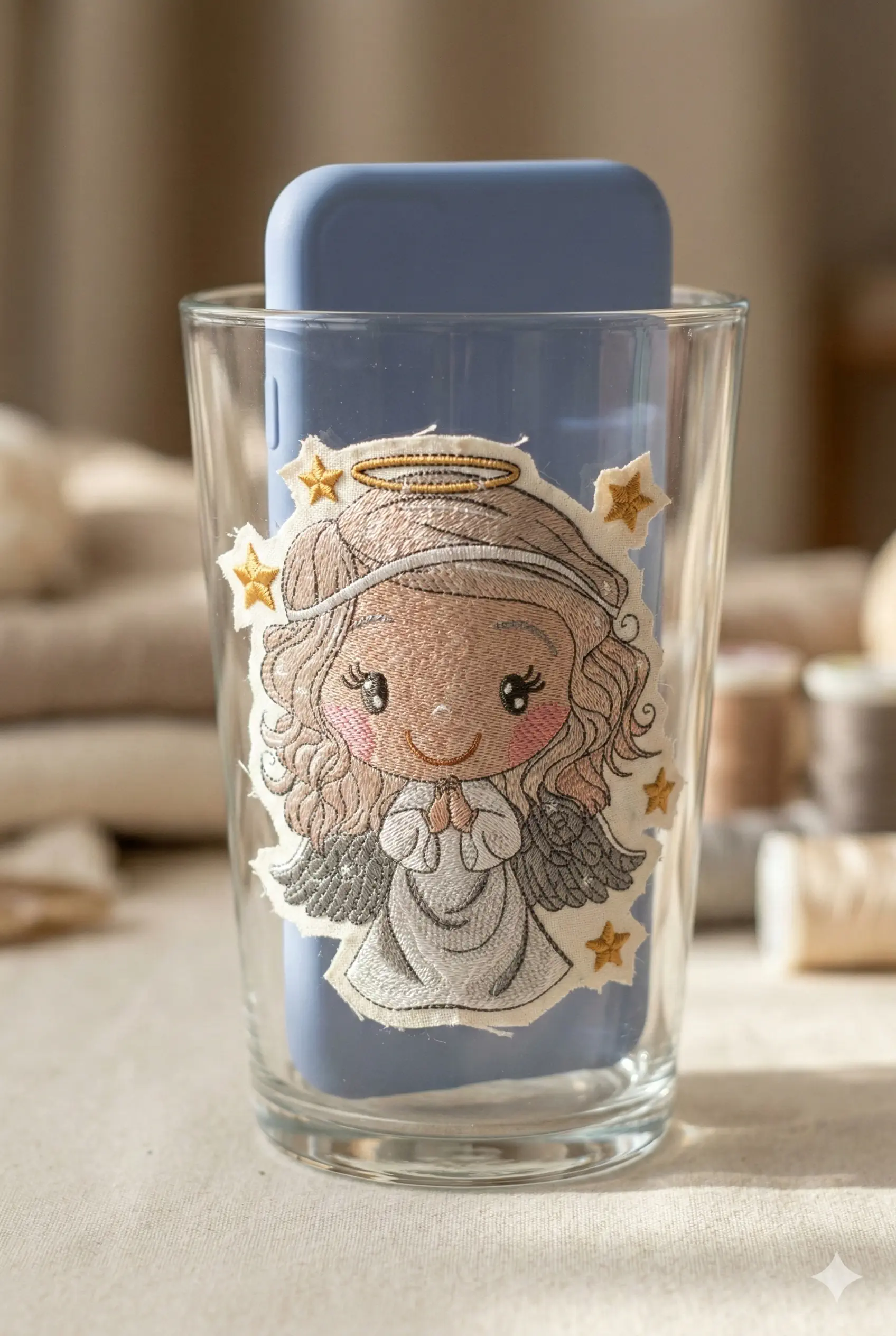 Transform everyday items into blessed heirlooms by stitching this graceful guardian figure on: