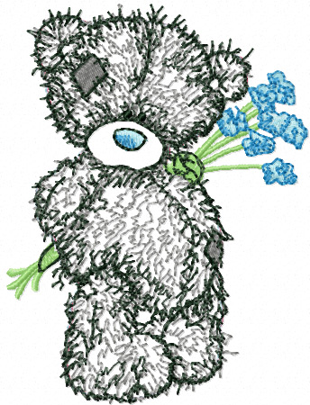 Charming Teddy Bear with Blue Flowers Applique Pattern