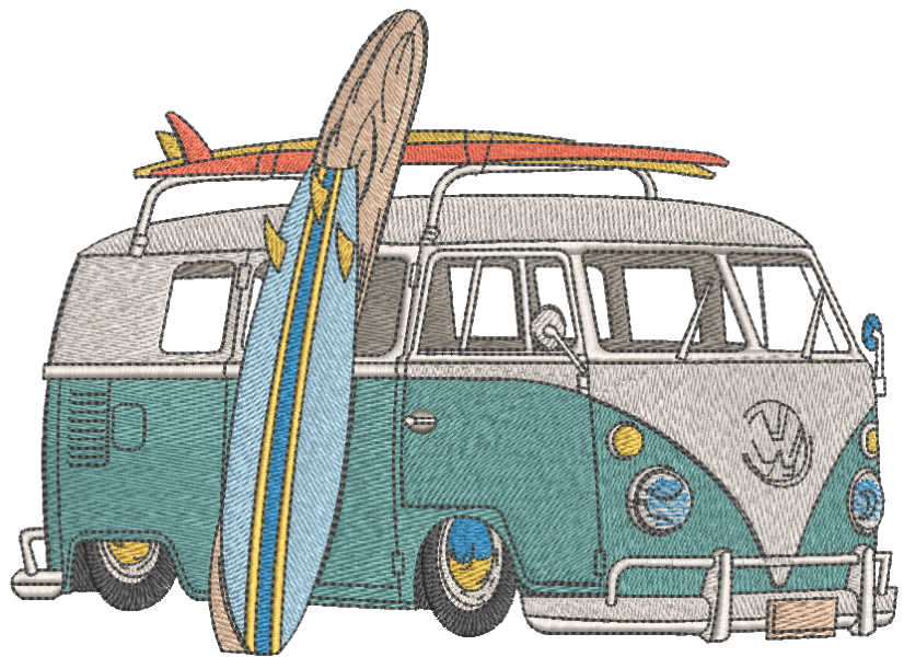 Surfing Minibus Embroidery Design for Adventure Seekers