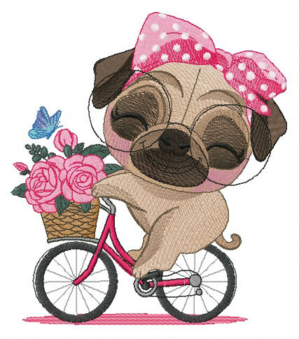 Charming Pug Riding Bicycle Embroidery Design