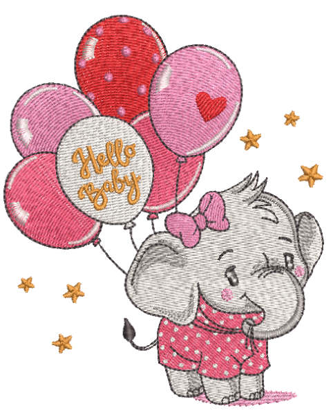 Bring warmth and whimsy to your creative projects with this enchanting African wildlife embroidery motif. The design features an endearing young elephant surrounded by cheerful balloons, capturing the gentle spirit of these magnificent savanna creatures. This digitized stitching pattern combines playful charm with the majestic beauty of nature, making it an ideal choice for anyone seeking to add a touch of joy to their needlework.