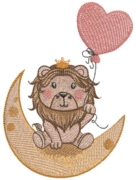 Bring a touch of whimsy and adventure to your embroidery projects with our enchanting design featuring the Lion King perched on a crescent moon, accompanied by a playful balloon. This delightful motif captures the essence of childhood wonder and is perfect for a variety of creative endeavors.