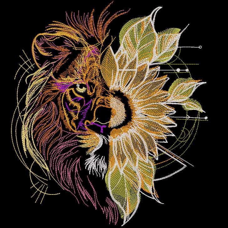 Dynamic Lion vs Sunflower Embroidery Design