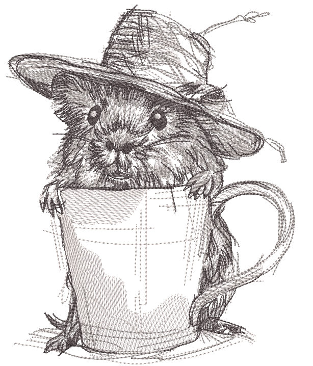 Mouse in a straw hat with a mug embroidery design