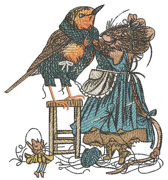 Mouse tailor sews clothes for starling embroidery design