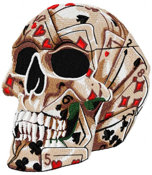 Introducing the Skull with Playing Cards embroidery design, a perfect blend of edgy style and intricate artistry. This design captures the essence of a classic skull motif intertwined with the excitement of playing cards, making it an ideal choice for a variety of projects.