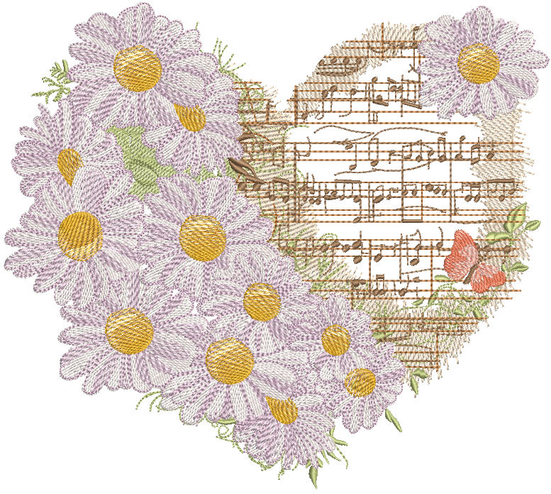 Music and daisies in the heart embroidery design