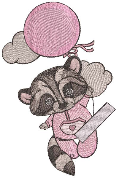 Raccoon in pink pajamas climbs on balloon embroidery design